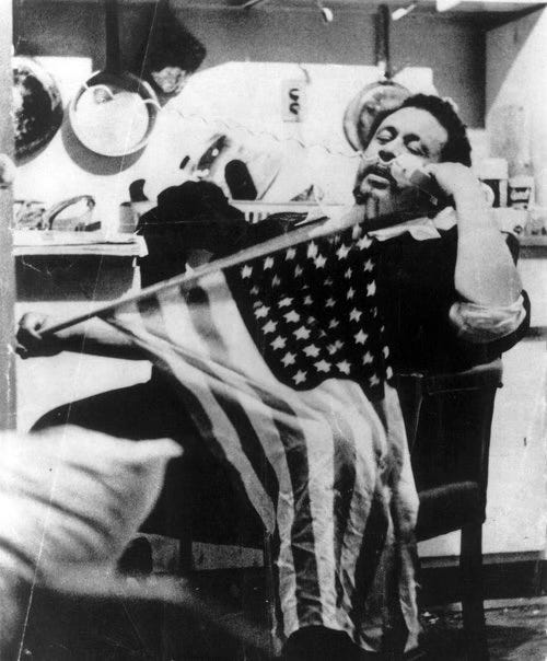 I pledge allegiance to the flag, the white flag ... When they say “black” or “Negro”, it means you’re not an American. ... I pledge allegiance to your flag—not that I have to, but just for the hell of it I pledge allegiance ... With no stripes, no stars... It is a prestige badge worn by a profitable, profitable minority ... I pledge allegiance to see that someday they will look to their own promises to the victims that they call citizens ... Not just the black ghettoes, but the white ghettoes, and the Japanese ghettoes, the Chinese ghettoes, all the ghettoes in the world. Oh, I pledge allegiance alright; I could pledge a whole lot of allegiance!